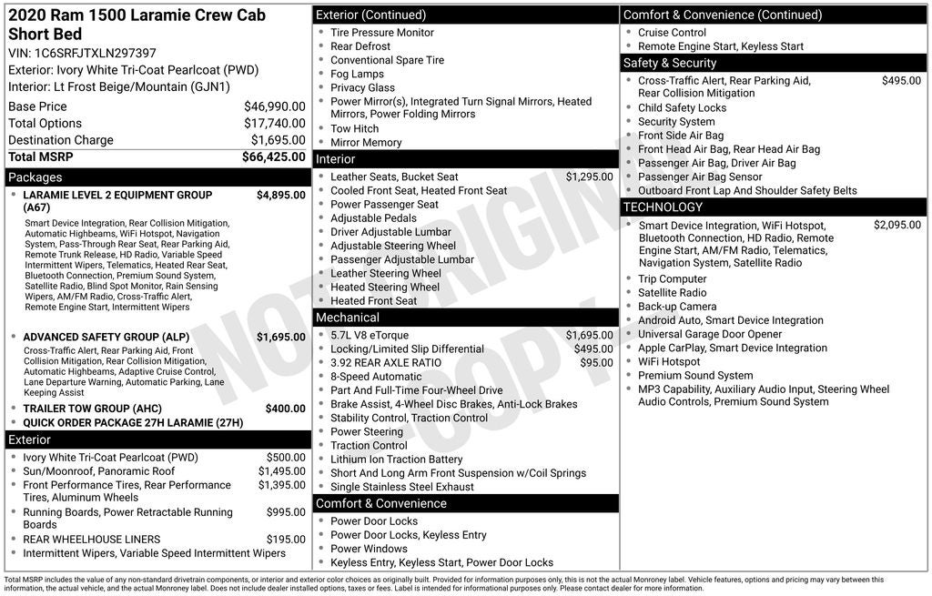 Finished in a stunning Ivory White Tri-Coat Pearlcoat exterior, this 2020 Ram 1500 Laramie is a true head-turner. Its bold, muscular styling and premium appointments set it apart from the competition, making it a must-see for any discerning truck buyer.